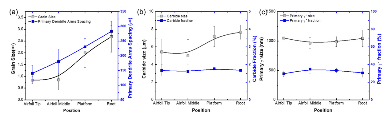 생성되며, Root에서는 결정립과 수지상의 크게 형성됨에 따라 탄화물 크기도 증가하게 된다[13]. 반면에 주조 응고 속도에 영향을 받지 않는 MC 탄화물 분율과 γ' 입자의 크기와 분율은 블레이드 위치에 상관없이 Airfoil Tip과 Root에서