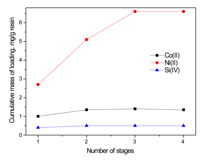 AG-1-X8 resin. Feed solution: Co(II) = 30 mg/L, Ni(II) = 1,000 mg/L, Si(IV) = 50 mg/L;