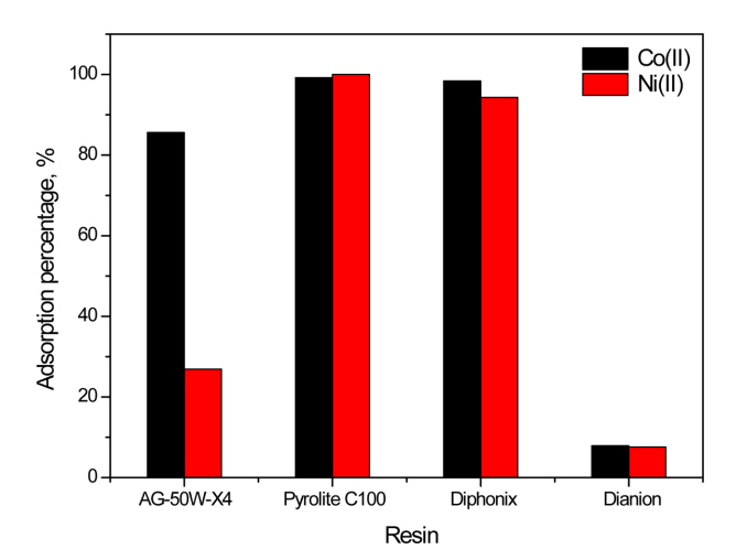 Co(II) = 1,000 mg/L and Ni(II) = 30 mg/L; pulp density of the resin = 20 g/L; shaking