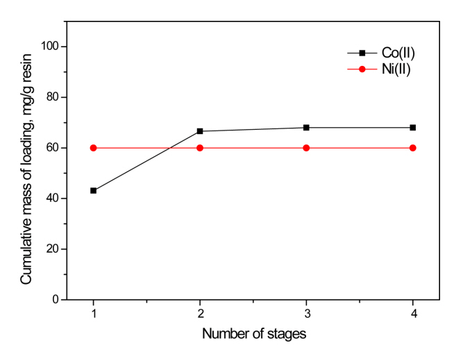 Loading capacity of Purolite resin for Co(II) and Ni(II) from 10% NH3 solution. Feed solution: Co(II) = 1,000 mg/L and Ni(II) = 30 mg/L; pulp density of