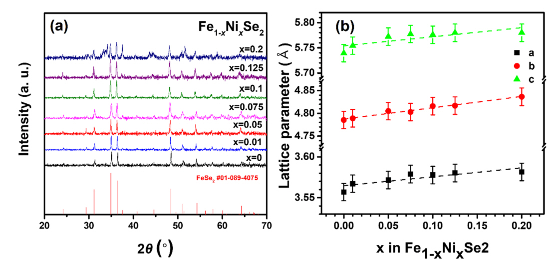 secondary phases including Fe2NiSe4 were observed in the x = 0.2 sample, which suggests that the Ni atoms were not well doped in the FeSe2 alloy after doping with x = 0.2. Therefore, subsequent measurements were performed, except for the x = 0.2 sample. The lattice parameters a, b, and c are shown in Fig 1(b) and were calculated using the (111), (012), and (121) diffraction peaks. The lattice