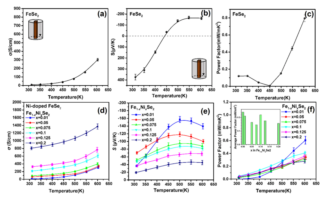 Figure 2 shows the measured σ and S values at different temperatures and the calculated power factor. The σ values (Fig 2(a)-(d)) systematically increased from 8.52 (undoped) to 328.78 S/cm (x = 0.125) at 300 K, with increasing Ni doping level, by approximately 38.6 times.