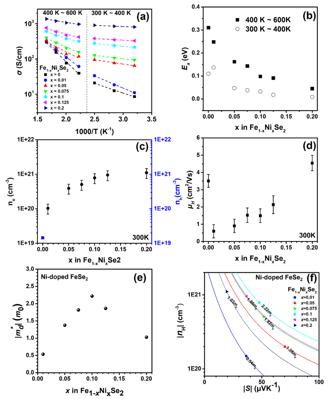 and thermoelectric properties of the transition-metal chalcogenide, FeSe2 doped with Ni. The σ, S, Hall carrier concentration, and Hall mobility were measured and the m* was calculated from the S and Hall carrier concentration.