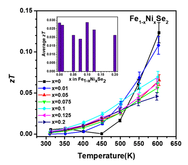 The zT values of the Ni-doped FeSe2 samples were calculated using the experimentally measured values of σ, S and κtot, and are shown in Fig 5. A zT of 0.11 was observed at x = 0.01 at 600 K, while the zT of other Ni-doped samples were 0.056-0.069 at 600 K. Even though the maximum zT shown for the pristine FeSe2 sample (x = 0) at 600 K was not further enhanced by the Ni doping, despite the κlatt decrease, the average zT (zTavg) of the sample with x = 0.01 at all temperatures had the highest value of 0.029, as shown in the inset