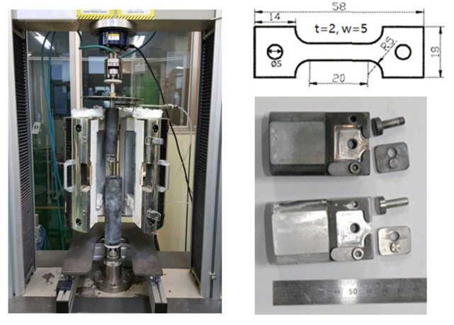 그림 1에 나타낸 바와 같이, 저항가열 방식의 전기로(Three-zone Split Furnace)가 부착된 2 Ton 하중 용량의 인장시험기(Universal