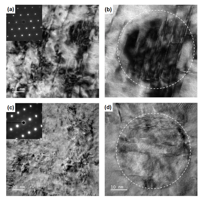 한편, LESS 합금의 상온 및 고온 미세 변형조직에 대한 TEM 분석 결과, 일부 결정립에서 수십 nm 간격의 슬립 밴드 또는 미세 트윈으로 보이는