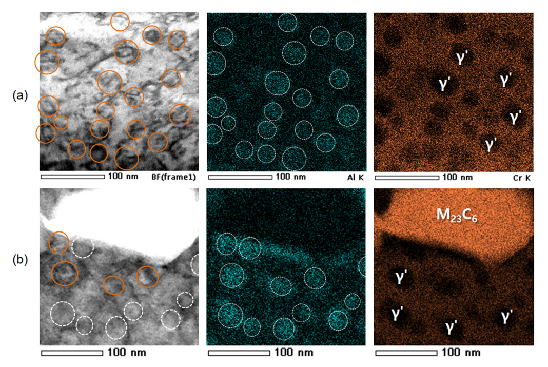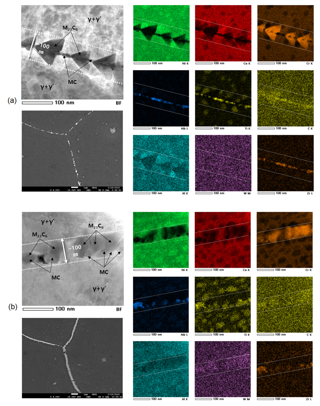 시효 열처리에 따라, 합금 모두 M23C6와 MC가 결정립계에 약 100 nm 폭으로 석출된 것으로 나타났다. 또한, 강화상 γ'은 기지 및 입계에 균일하게 석출하였고, γ' 무석출영역은
