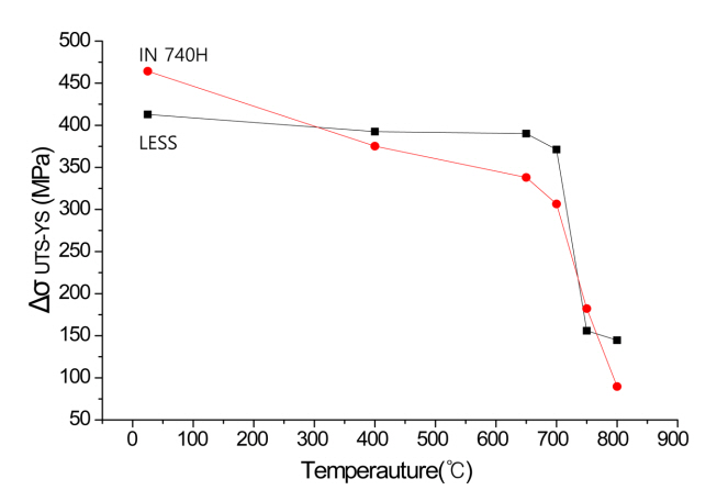 그림 12는 각각의 시험온도에서 두 합금의 항복점 이후 인장강도에 도달하기까지의 응력 증가분(ΔσUTS-YS, stress increment due to strain-hardening)을 나타낸 것이다. 상온에서 700°C까지는 항복점 이후 응력 증가분이