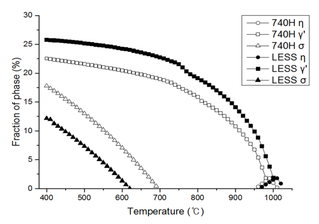 η 상이 생성되지 않는 범위에서 γ' 생성 원소인 Ti와 Al의 비율을 1:1로 하면서 최대(1.5%)로 첨가한[21] 결과, Ti와 Al을 1.35% 첨가한 740H 합금의 γ' 분율 15.5% 대비 LESS 합금의 γ' 분율이 18.5% 로 다소 높게 생성되었다.