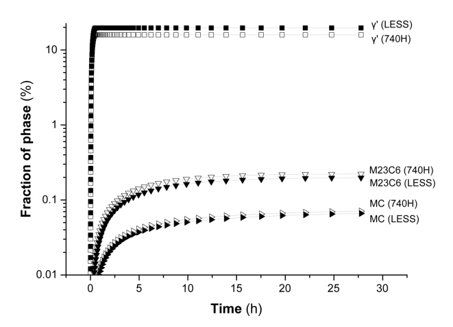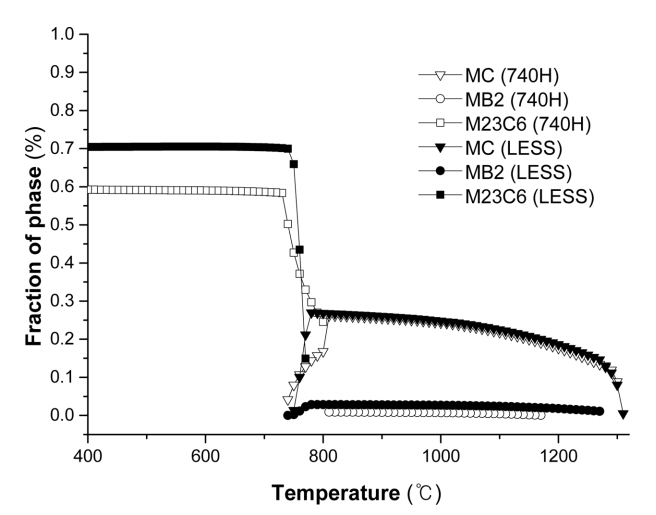 MC는 LESS 합금과 IN 740H 합금에서 각각 0.058%, 0.063%, M23C6은 각각 0.186% 0.212% 생성되는 것으로 나타났다.