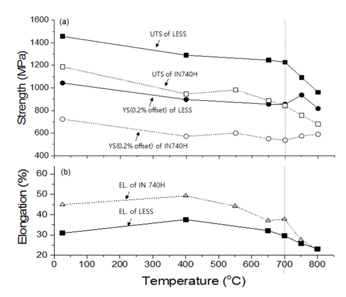 각각 1,147 MPa, 736 MPa, 700°C에서 각각 982 MPa, 621 MPa이었고, LESS합금의 인장강도와 항복강도는 상온에서 각각