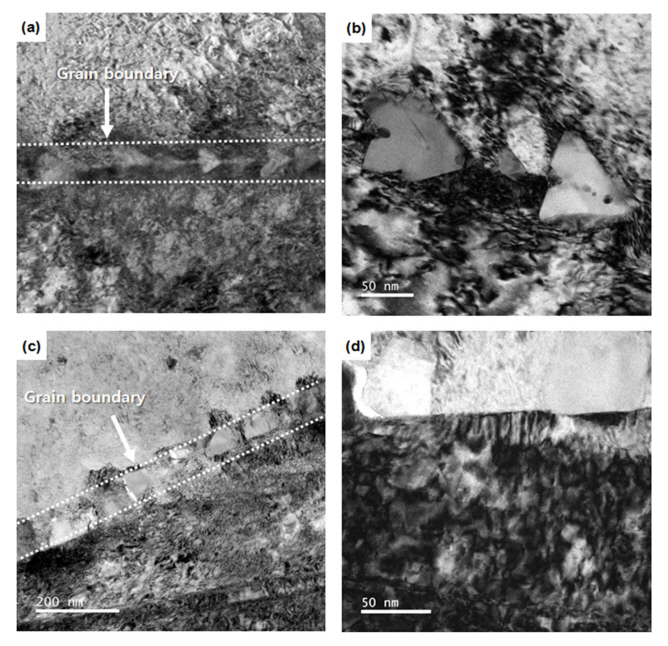합금(그림 9 (c), (d))에서는 결정립계가 전위 이동의 장벽으로 효과적인 작용을 하고 있다는 것을 알 수 있다. 따라서 결정립 크기 차이에도 불구하고, 이러한 결정립계의