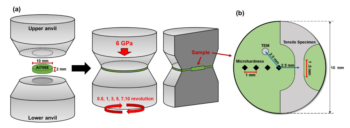 표 1은 본 연구에서 활용한 Al7068 압출재(㈜동산테크, 대한민국)의 화학적 조성을 나타내었다. 상온에서의 HPT 공정을 수행하기 위해 그림 1(a)와 같이 지름 10 mm, 두께 2 mm의 디스크 모양으로 제작된 Al7068 합금 시편을 준비하였으며, HPT 공정은 6 GPa의 압력을 가한 상태에서