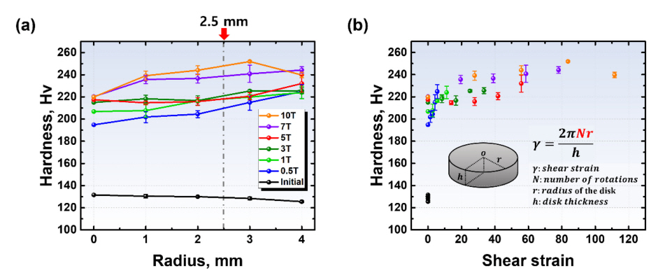 10T에서 최대 250 Hv까지 증가함을 확인하였다. 그러나, 본 결과에서는 변형량에 따른 경도 변화를 정량적으로 확인하는데 한계가 있으므로 그림 2(b)와 같이 전단변형에 따른 미소경도 값을 나타내었다. 이때, 그림 2(b)의 가로축인 HPT 공정 중 시편이 받는 전단변형량은 다음과 같은 식으로 계산된다[20]: