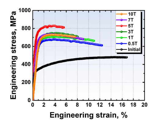 불구하고 인장시험 중 확인되는 항복강도 및 인장강도는 그림 2(b)의 경도와 유사하게 변형량 증가에 따른 향상 및 포화가 발생함을 확인했다. 특히, 인장강도는 경도 값과 달리 5T에서 최대값을 보이고 오히려 감소하는