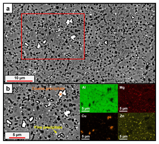 그림 4는 Al7068 합금의 초기 시편을 SEM 후방산란전자모드 (backscattered electron; BSE)로 관찰한 미세조직과 에너지분산스펙트럼(Energy