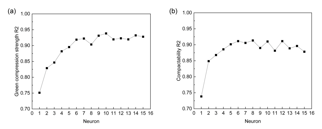 Predictive performance according to the number of neurons (a) green compression strength