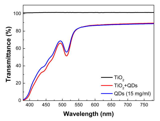 layer, HIL)은 MoO3 및 상부 전극은 Aluminum을 열증착법으로 박막을 형성하였다. 소자의 성능 비교를 위해 TiO2 NPs을 ETL로 사용하는 QLEDs의 경우 TiO2 NP을 1000 rpm에서 60초 동안 코팅한 뒤, QDs를 2000 rpm으로 20초 동안 코팅하였으며, 다른 공정은 동일하게 진행하였다. 투과도는