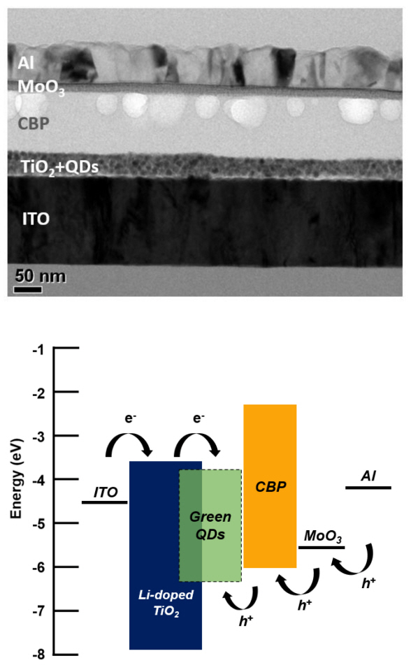 A cross-sectional TEM image and energy band structure of QLEDs with a mixed layer