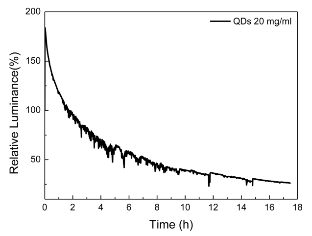 cd/m2의 밝기로 환산하는 방식을 사용한다. 따라서 TiO2 NPs과 QDs 혼합층을 가지는 역구조 QLED 소자의 수명안정성은 1,600 cd/m2의 밝기에서 가속수명법으로 측정되었다. 아래 그림 5에서 T50 가속수명은 7.3 시간으로 100 cd/m2의 밝기로 환산하면 1,420 시간이다. ETL이 없는 혼합층을 가지는 단순화된 소자구조에서 나타난 수명 결과이므로 큰 의미가 있고 생각되며, 향후