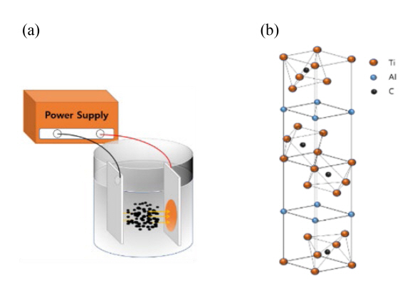 (a) Schematic illustration of electrophoretic deposition of MAX(Ti3AlC2) onto 25 µm Cu foil. (b) Crystal structure of MAX(Ti3AlC2) phase.