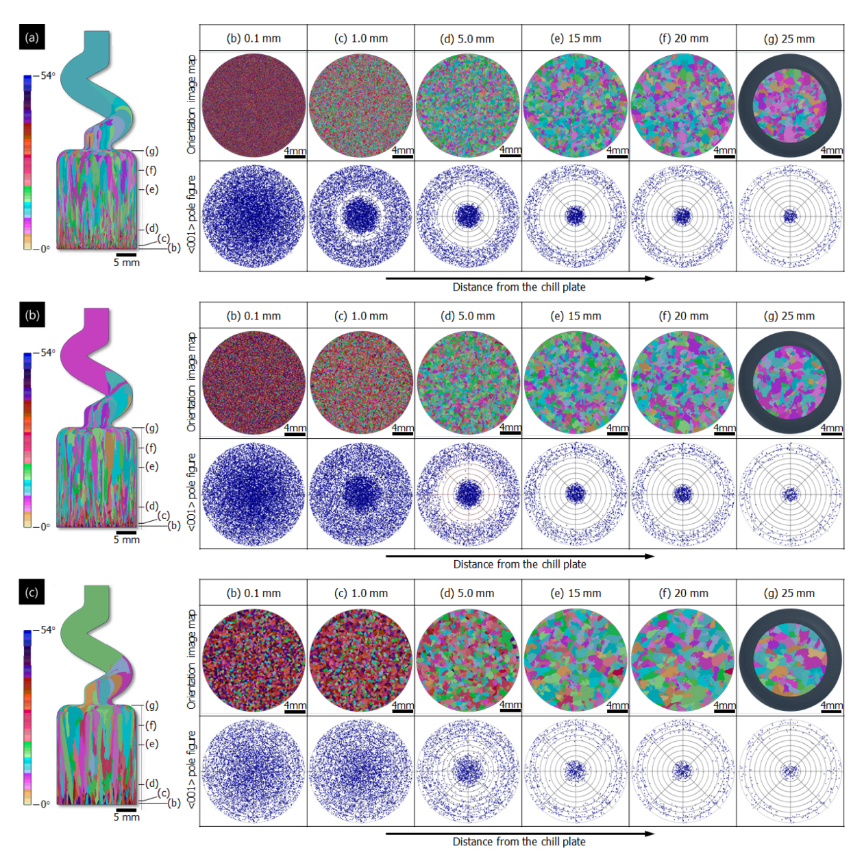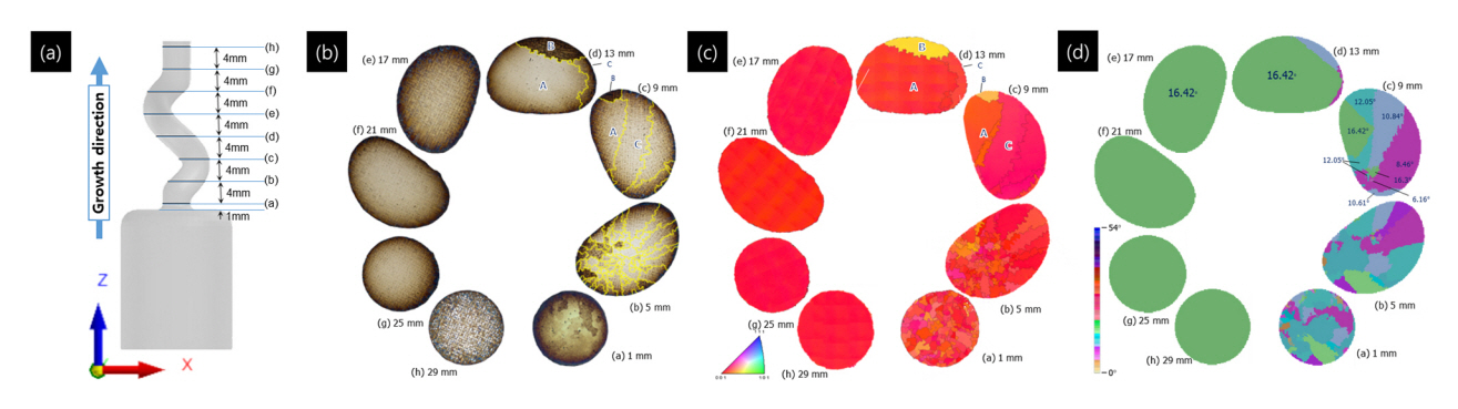 그림 3-(b), (c)와 (d)는 각각 Spiral selector 내에서 일어나는 단결정 선택 과정에 대한 조직 사진 및 EBSD, 전산해석으로 예측된 자료이다. 해당 그림 3-(b), (c)에서 보이는 결과는 Seo 등[24]의 연구 결과와 같이 Spiral selector 내벽에 위치한 결정립이 최종 단결정으로 선택되는 결과를 확인할 수 있었다.