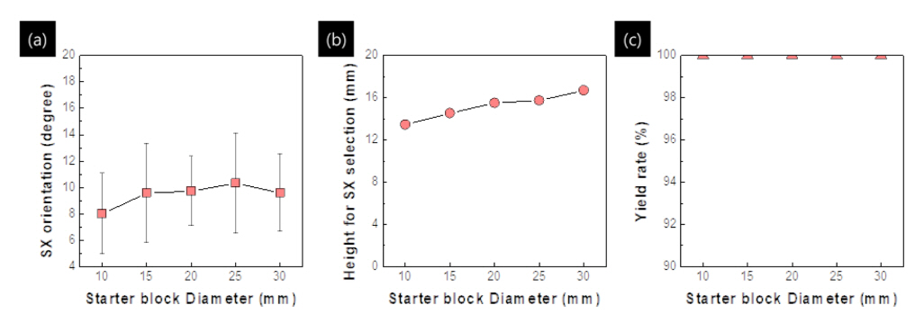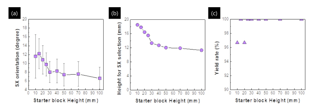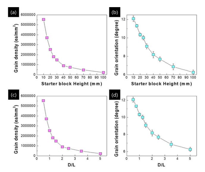 단결정 부품 제조를 위한 많은 연구 사이[15, 24-35]에서도 Starter block에 관한 고찰이 이루어졌으나, Starter block의 요소 변화에 따른 결정립들의 평균 밀도와 평균 각도에 대한