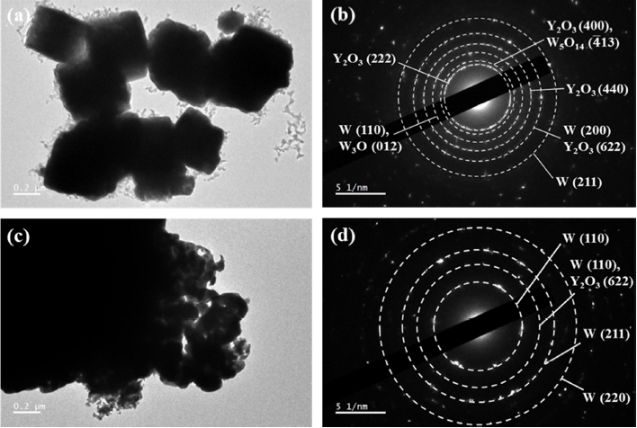 SAED 분석결과(그림 3b) W 및 Y2O3 상과 함께 W-산화물 상들이 일부 존재함을 알 수 있다. 따라서 USP한 분말의 수소분위기 열처리과정에서 충분한 환원이 일어나지 않아 각형입자 형태의