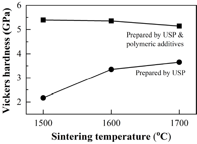 그림 7은 HIP처리한 시편의 Vickers 경도를 SPS 온도에 따라 표시한 것으로 USP로 합성한 분말은 2.3~3.6 GPa, USP/폴리머 용액공정의