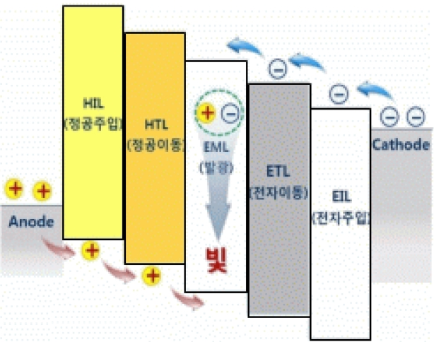 그림 1은 일반적인 OLED 소자의 구조이다. 양극과 음극은 전류를 공급하는 배선 전극이므로 전기전도도가 좋은 ITO나 알루미늄, 은 등의 금속을 사용하고