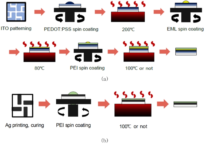 동안 코팅한 후 핫 플레이트에서 80 oC, 10 분 동안 열처리하여 잔여 솔벤트를 제거하였다. 전자 주입층인 PEI는 6,000 rpm에서 60 초 동안 스핀 코팅 한 후 핫 플레이트에서