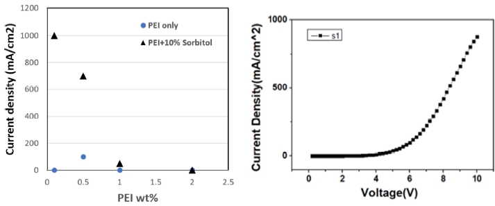 전기 전도도 향상에 대한 보다 상세한 메커니즘을 규명하는 것은 이후 실험을 통하여 밝혀 나갈 것이다. 조비톨을 첨가했더라도 1%, 2%의 PEI 용액에서는