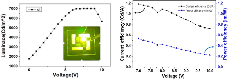 제작한 결과 그림 7과 같은 점등 특성을 확보할 수 있었다. 소자는 4 V에서 점등이 시작되어 7,000 cd/m2의 최대 휘도를 얻었는데 이는 다른 이들이 용액 공정을 이용하여 제작한 OLED 소자에서 보고된 휘도 범위(600~22,000 cd/m2)의 중간 정도에 해당하는 값이다. 이 결과에 의하면 기존 용액 공정에 비하여 전극을 별도로 제작함으로 인하여 인쇄 전극의 용매가 소자에 침투되는