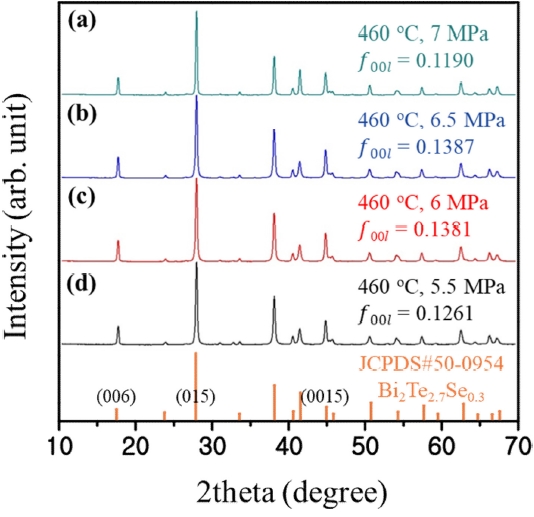 압출온도를 460 oC로 설정한 상태에서 압출압력을 5.5–7 MPa 범위에서 변화하여 압출체를 제조하였다. Fig 3에 나타낸 바와 같이 압출압력에 따라 상 형성 거동에는 큰 변화가 관찰되지 않았다. 하지만, 00l 방향으로의 결정배향도를 나타내는 식(2)의 Lotgering factor(f)에 차이를 나타내었다.