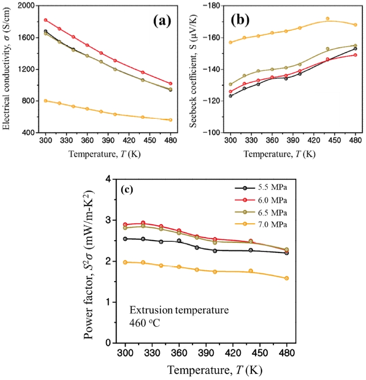Fig 5에는 460 oC의 압출온도에서 압출압력을 5.5–7 MPa로 변화하여 제조한 압출체의 전기전도도 및 제벡계수 온도의존성을 나타내었다.