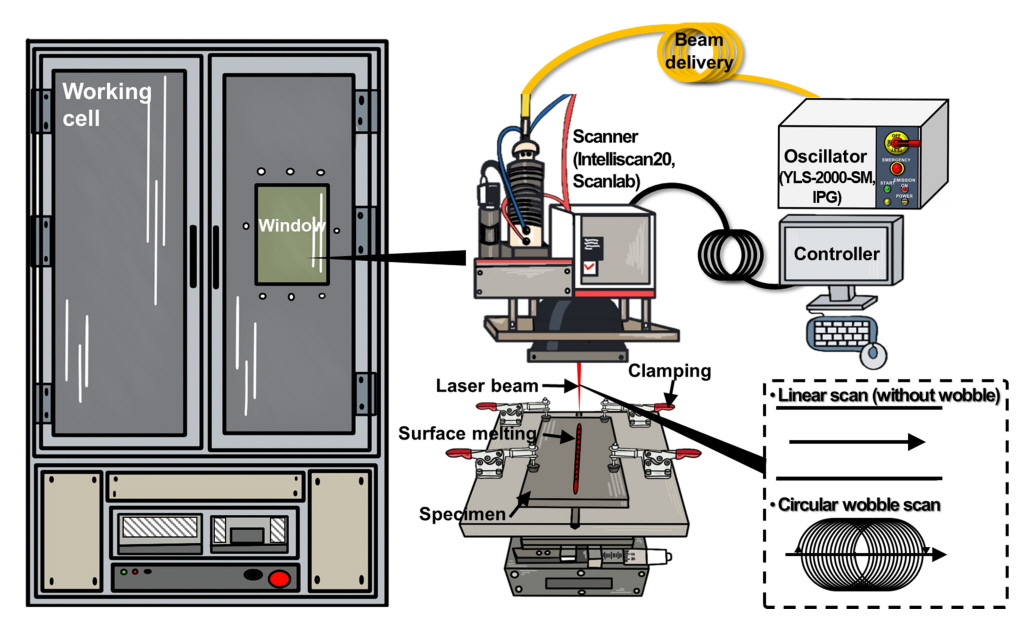 ์ฑ๊ธ๋ชจ๋ ํ์ด๋ฒ ๋ ์ด์ (YLS-2000-SM, IPG)๋ฅผ ์ด์ฉํด ํ๋ฉด์ฉ์ต์ฒ๋ฆฌ๋ฅผ ์ค์ํ์๋ค. ๊ทธ๋ฆผ 1์ ์ด๋ฅผ ์ํ ๋ ์ด์ ์ฅ์น ๋ฐ ์คํ๊ณผ์ ์ ๋ํ๋ธ๋ค. ๋ณธ ๋ ์ด์ ๋ฐ์ง๊ธฐ๋ ์ต๋์ถ๋ ฅ 2 kW, ํ์ฅ 1070 nm, ๊ทธ๋ฆฌ๊ณ 1.05์ M2 ๊ฐ์ ๊ฐ์ง๋ฉฐ, ์๊ฒฉ ์ค์บ๋(intelliSCAN20, Scanlab)์ ์ฐ๋ํ์ฌ ์ ์ด์ ์กฐ๊ฑด์์ 38 ฮผm์ ๋น ์ง๊ฒฝ์ ๊ฐ์ง๋๋ก ์ค์ ํ์๋ค. ํ 2๋ ๋ํ์ ์ธ ๋ ์ด์ ์ฉ์ต ์กฐ๊ฑด์ ๋ํ๋ธ๋ค.