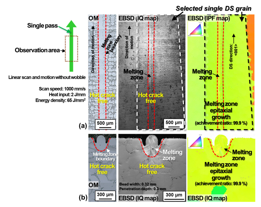 OM, EBSD images of single-pass laser melting (a) surface and (b) cross-section for