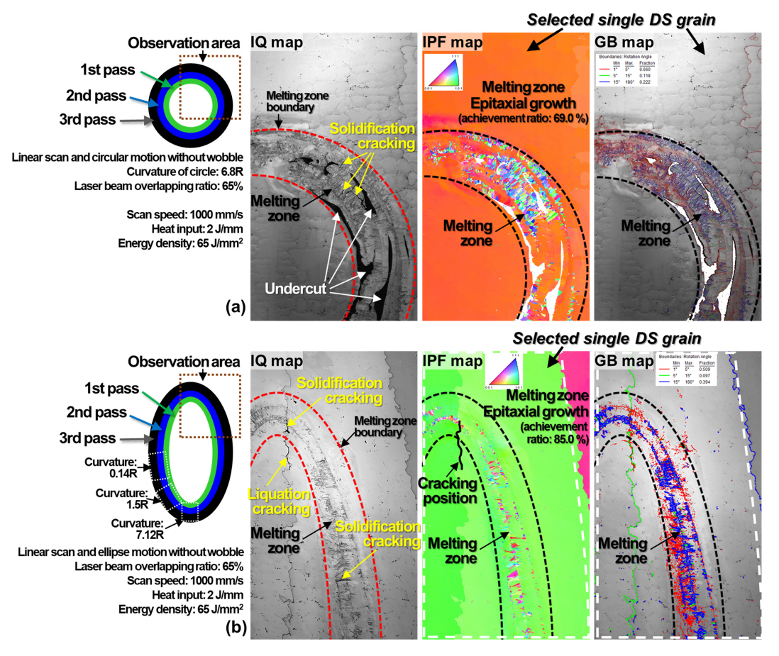 EBSD images of triple-pass laser melting surface under (a) circular and (b) ellipse