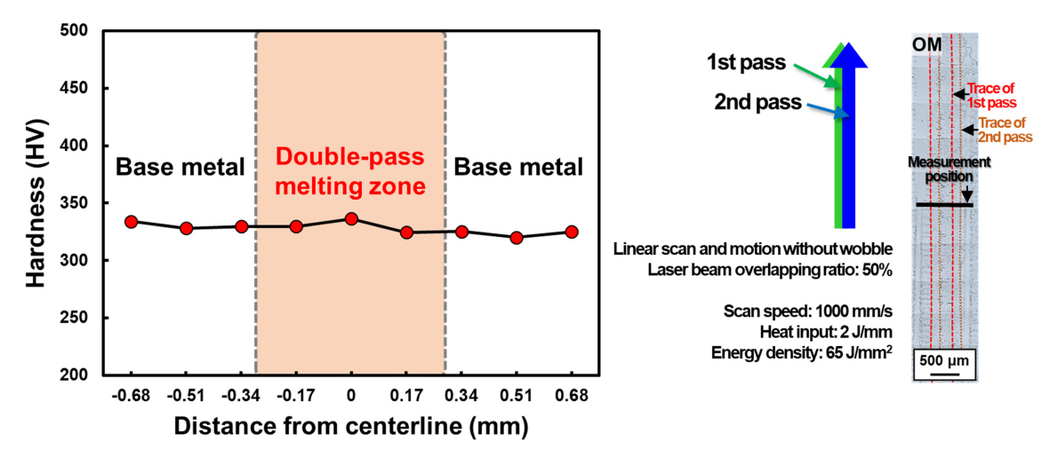Hardness distribution of hot crack-free laser melting zone of 247LC-DS specimen