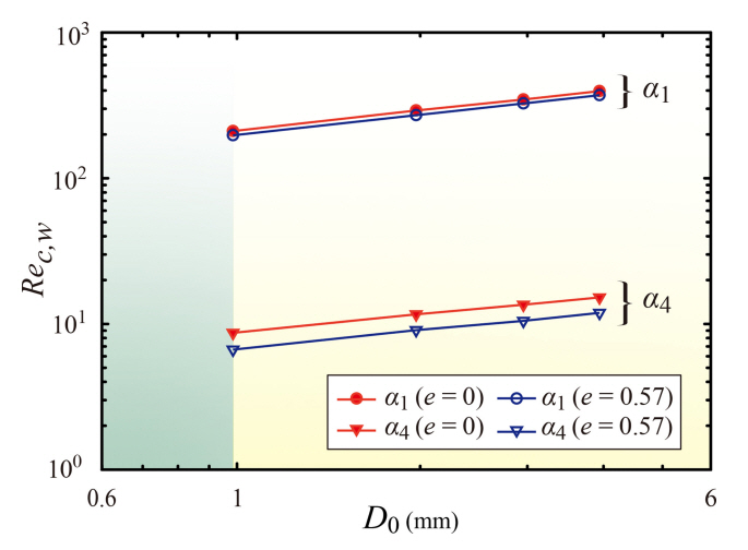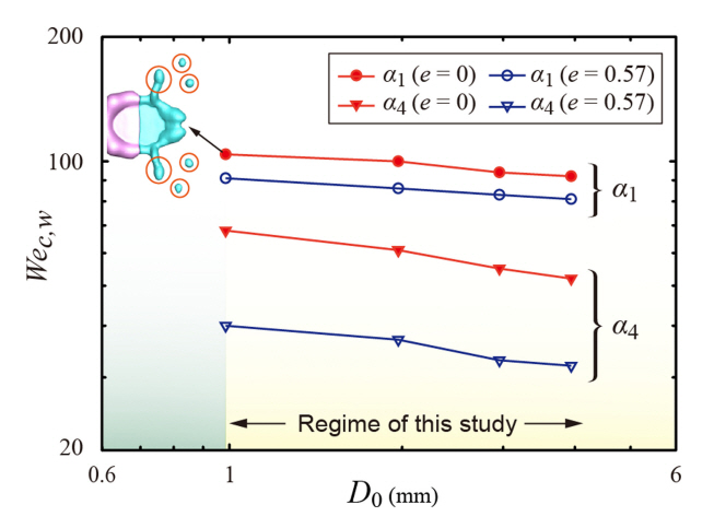 viscosity ratios of α1 and α4, respectively. The diagram indicates that the Rew threshold increases with an increase of D0. The detachment of W-parts from mother drops is more likely to occur once the viscosity