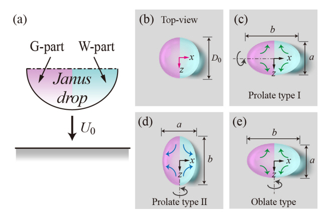 (a) Schematics of the initial configuration of the ellipsoidal Janus drop impact on