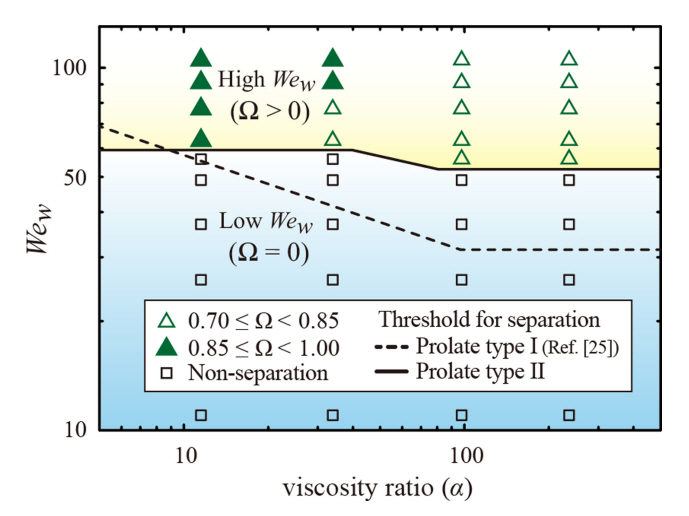Regime map of the separation efficiency as a function of the viscosity ratio and Wew under Prolate type II. Rectangle and triangle symbols represent non-separation (low-Wew regime) and separation (high-Wew regime) cases between two fluidic parts, respectively. Solid and dashed lines indicate