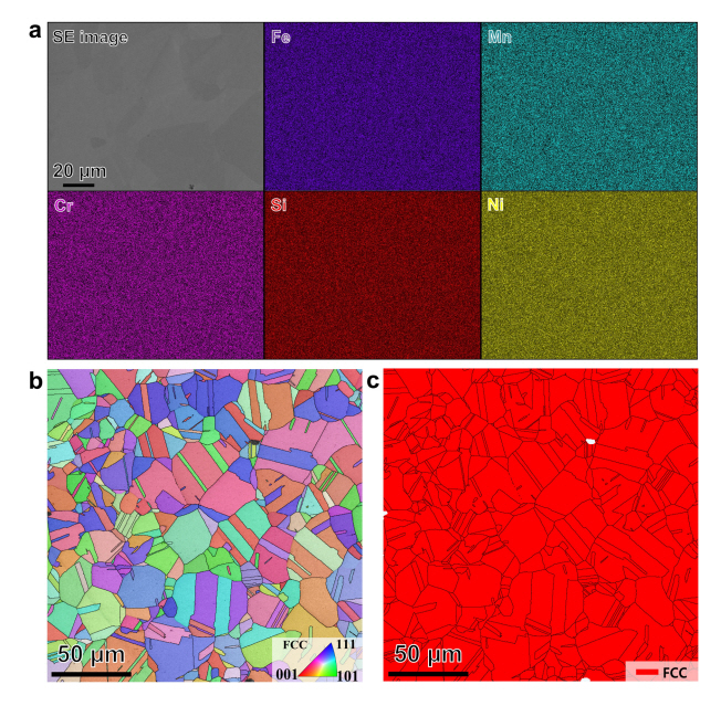 그림 3a는 Fe-Mn-Cr 합금의 SE 이미지 및 EDS 맵핑 결과를 보여준다. SE 이미지에서 확인되는 것과 같이 조대한 결함은 전혀 관찰되지 않았으며