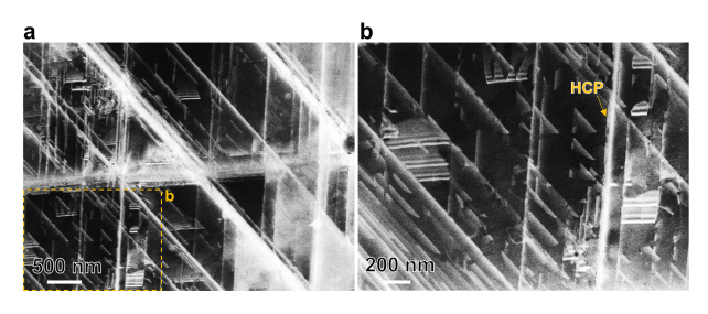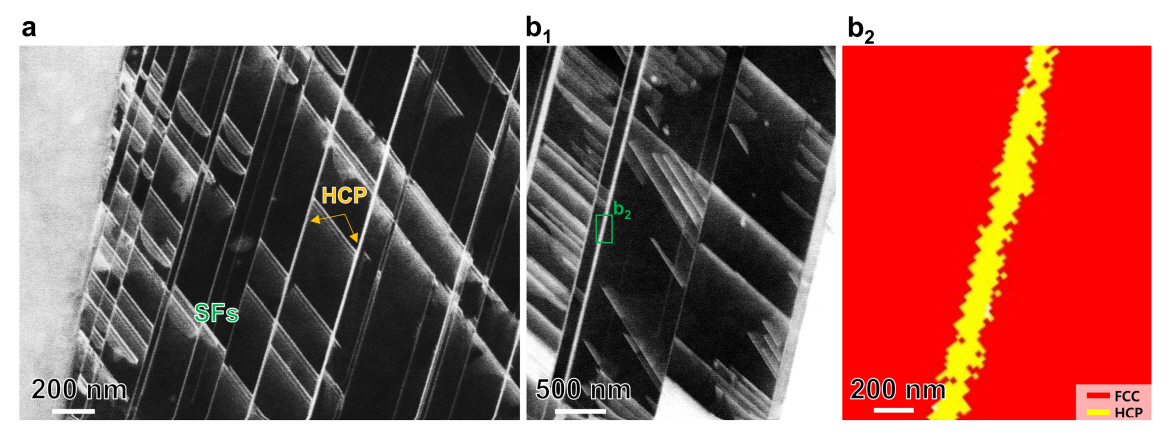 확인되었다. 그러나, 고 배율의 ECC 이미지 관찰 결과, 다량의 적층 결함과 함께 ~20 nm 수준의 HCP thin plate가 존재하였다.