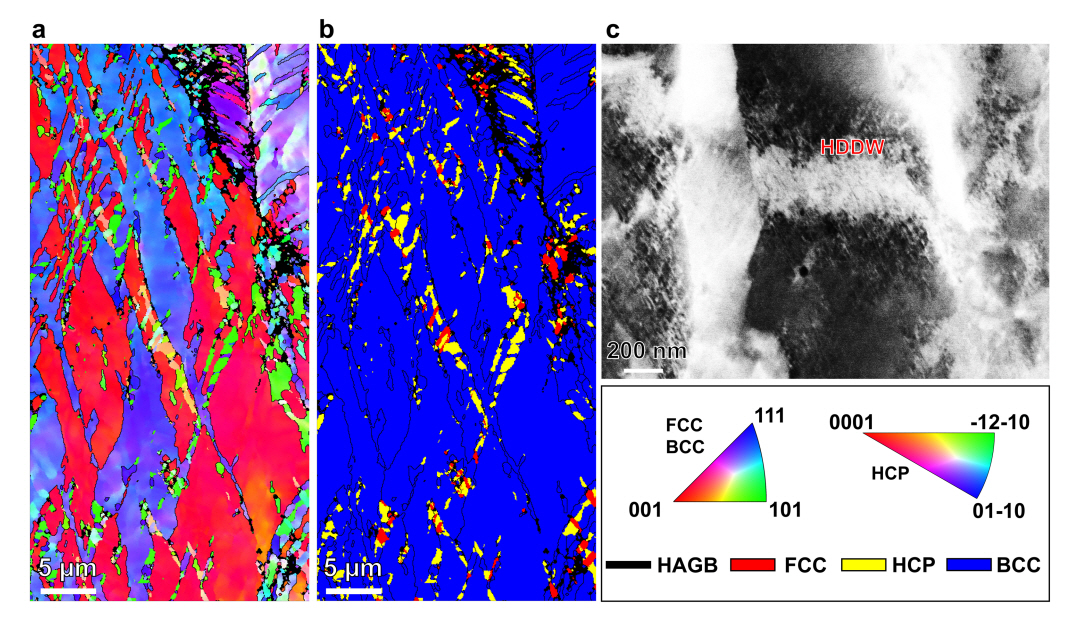 결과 (그림 7c), BCC 마르텐사이트 계면에서 high density dislocation wall (HDDW)가 관찰되었으며, 이를 통해 BCC 마르텐사이트가