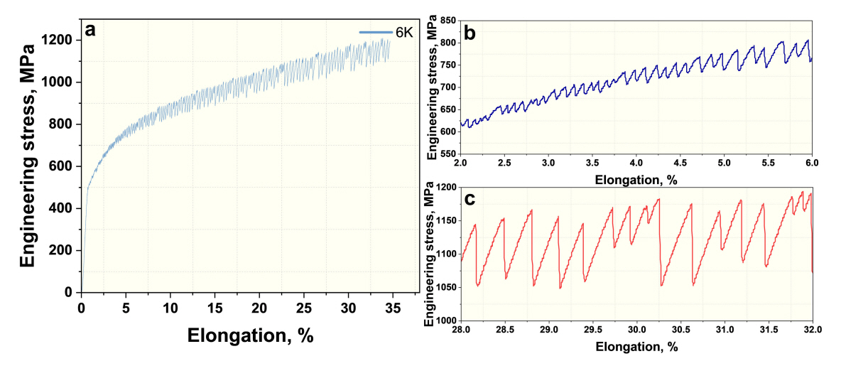 (a) Engineering stress-strain curve at 6 K and (a) Engineering stress-strain curve