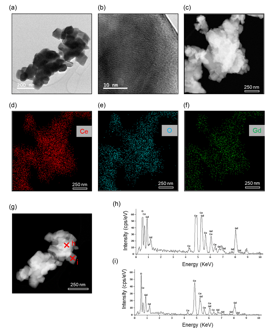 of GDC NPs. (g)–(i) TEM-EDS point analysis of GDC NPs.