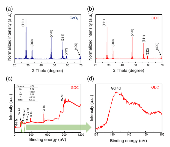 XRD patterns of (a) pristine CeO2 and (b) GDC NPs. (c) XPS survey of GDC NPs and (d) XPS Gd 4d core-level region.