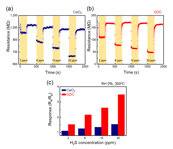 Fig 3(a) and (b) show the real time resistance plots of the pristine CeO2 and GDC gas sensors, respectively, at 2, 6, 10, and 20 ppm H2S at 350 °C. For both gas sensors, the resistances decreased after H2S gas injection, indicating the n-type nature of both gas sensors, arising from the