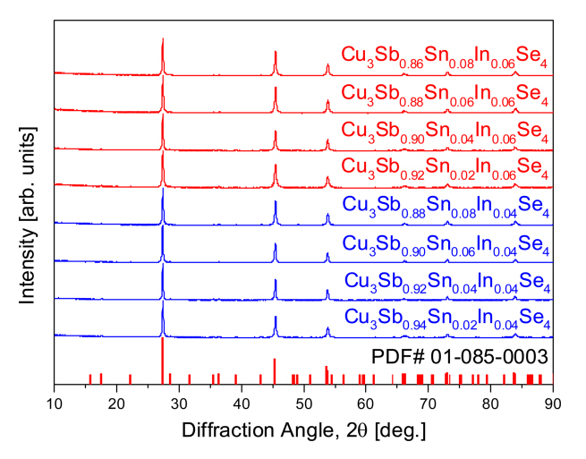Figure 1 shows the XRD patterns of Cu3Sb1−x−ySnxInySe4 prepared by the MA–HP method. All diffraction peaks correspond to a single phase
